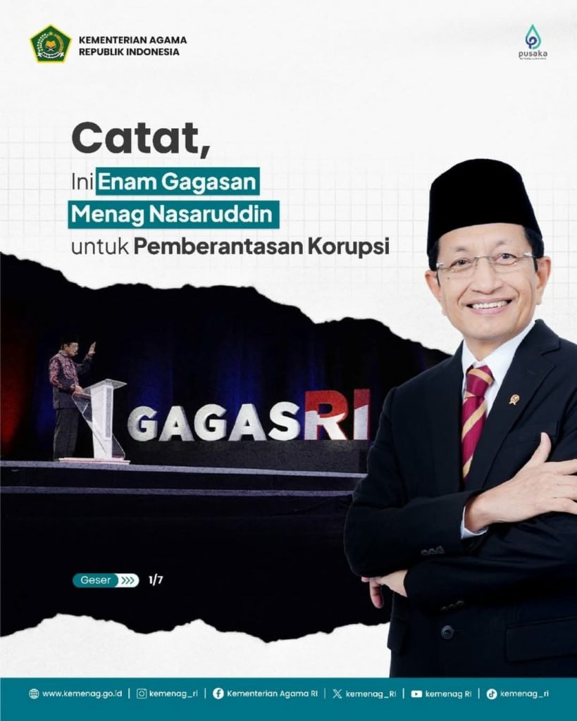 Ada 6 gagasan pemberantasan korupsi, yakni 1) Agama dari mitos jadi etos, 2) Jadikan korupsi musuh bersama, 3) Mulai dari Kemenag, 4) Jangan ambil bukan hak, 5) Lahirkan generasi berprinsip dan jujur serta 6) Pentingnya keteladanan