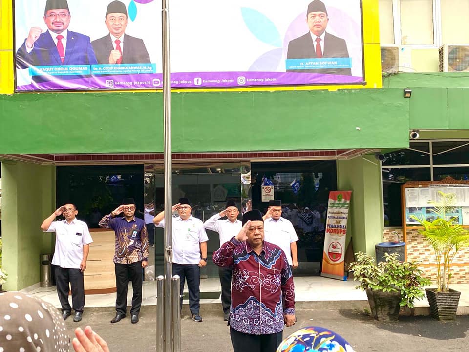 Kasubbag Tata Usaha Akhmad Iksan memimpin Apel di lingkungan Kankemenag Kota Jakarta Pusat, Senin (05/02)