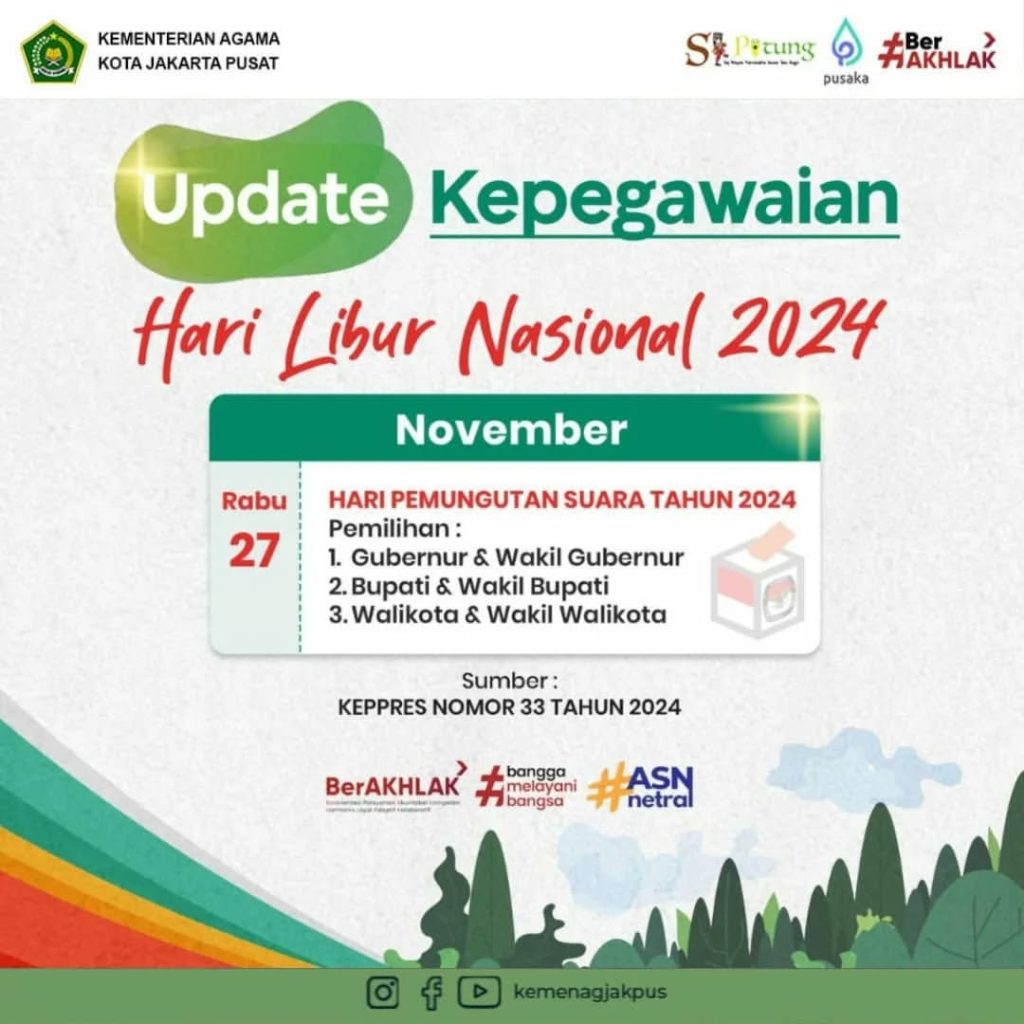 Pemerintah juga telah menetapkan hari Rabu tanggal 27 November 2024 sebagai hari libur nasional. Hal ini tercantum di Keppres 33/2024, SE Menaker 1/2024, dan PKPU 2/2024