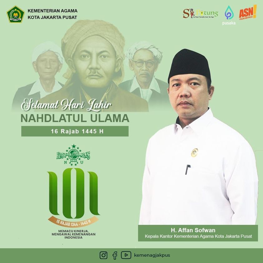Selamat Hari Lahir ke-101 NAHDLATUL ULAMA / Umum / Oleh admin Segenap pimpinan dan ASN Kankemenag Kota Jakarta Pusat mengucapkan: Selamat Hari Lahir ke-101 NAHDLATUL ULAMA 16 Rajab 1445 H Memacu Kinerja, Mengawal Kemenangan Indonesia Post Views: 887