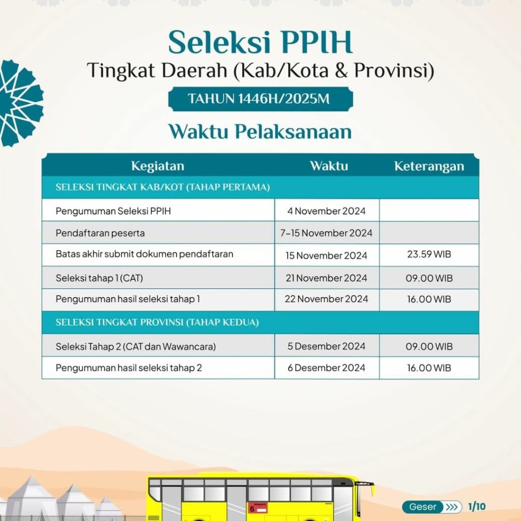 Adapun seleksi Petugas Haji di tingkat pusat akan diumumkan kemudian. Untuk tingkat daerah, pertama adalah PPIH Kloter dan kedua PPIH Arab Saudi